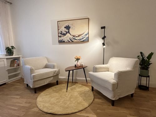 Praxisraum 1 ist mit Besprechungstisch, Liegecouch bzw. Sitzecke eingerichtet. Er eignet sich für Einzeltherapie, Paartherapie, Coaching, Training, Supervision und Kleingruppen bis zu 4-5 Personen.