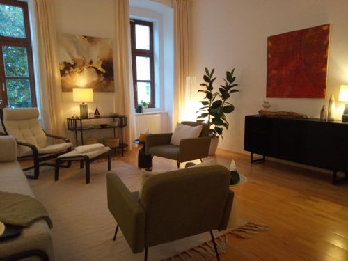 Praxisraum 1 ist mit Besprechungstisch, Liegecouch bzw. Sitzecke eingerichtet. Er eignet sich für Einzeltherapie, Paartherapie, Coaching, Training, Supervision und Kleingruppen bis zu 4-5 Personen.